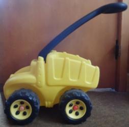 A dump truck that can be pushed around the house or remove the handle and play with it like any toy vehicle.